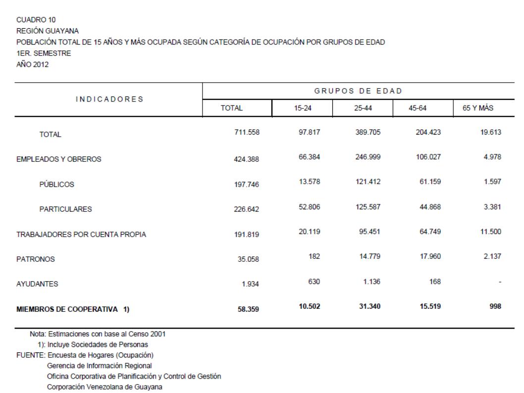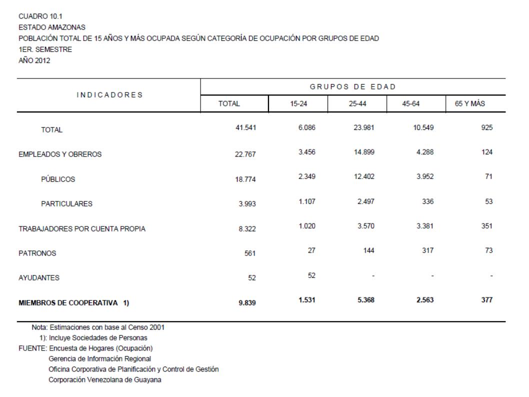 10.1 Estado Amazonas Población Total De 15 Años Y Más Ocupada Según Categoría De Ocupación Por Grupos De Edad, Año: 2012