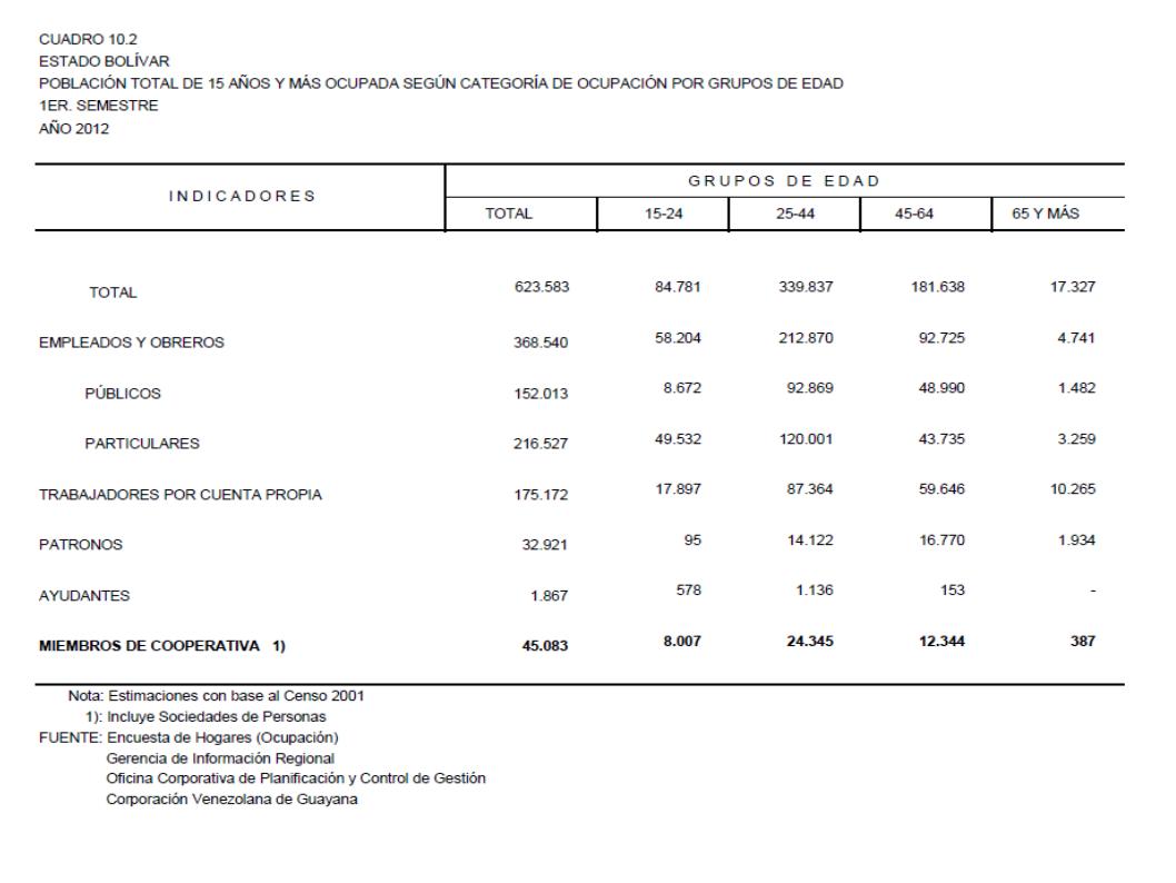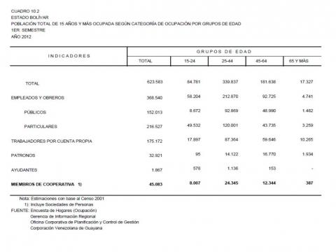10.2 Estado Bolívar Población Total De 15 Años Y Más Ocupada Según Categoría De Ocupación Por Grupos De Edad, Año: 2012