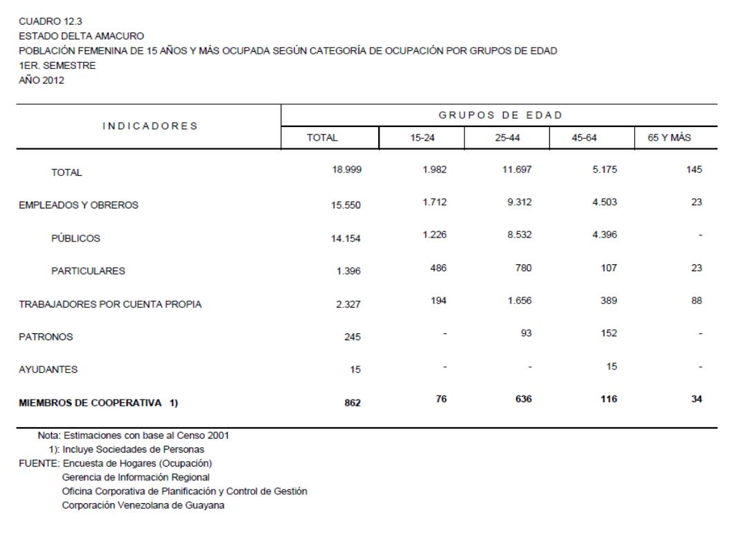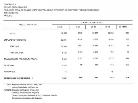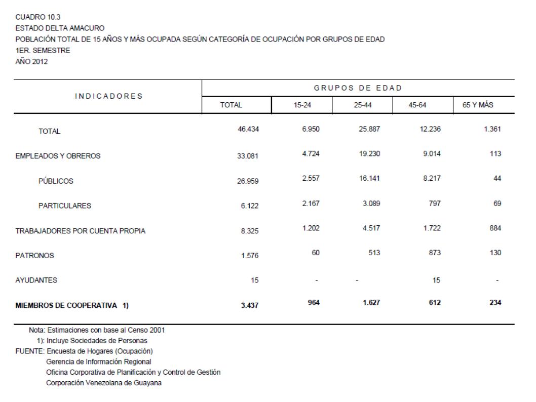 10.3 Estado Delta Amacuro Población Total De 15 Años Y Más Ocupada Según Categoría De Ocupación Por Grupos De Edad, Año: 2012
