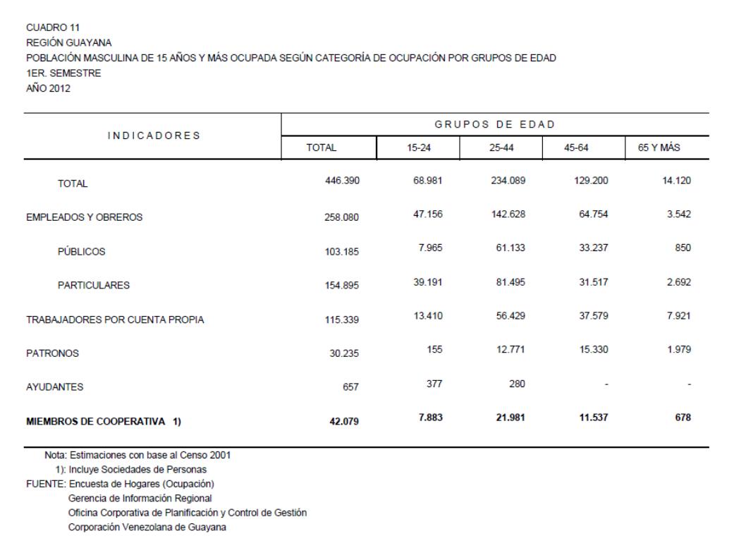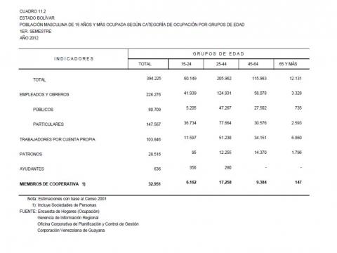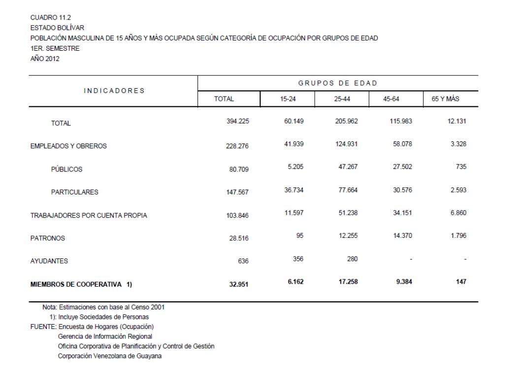 11.2 Estado Bolívar Población Masculina De 15 Años Y Más Ocupada Según Categoría De Ocupación Por Grupos De Edad, Año: 2012