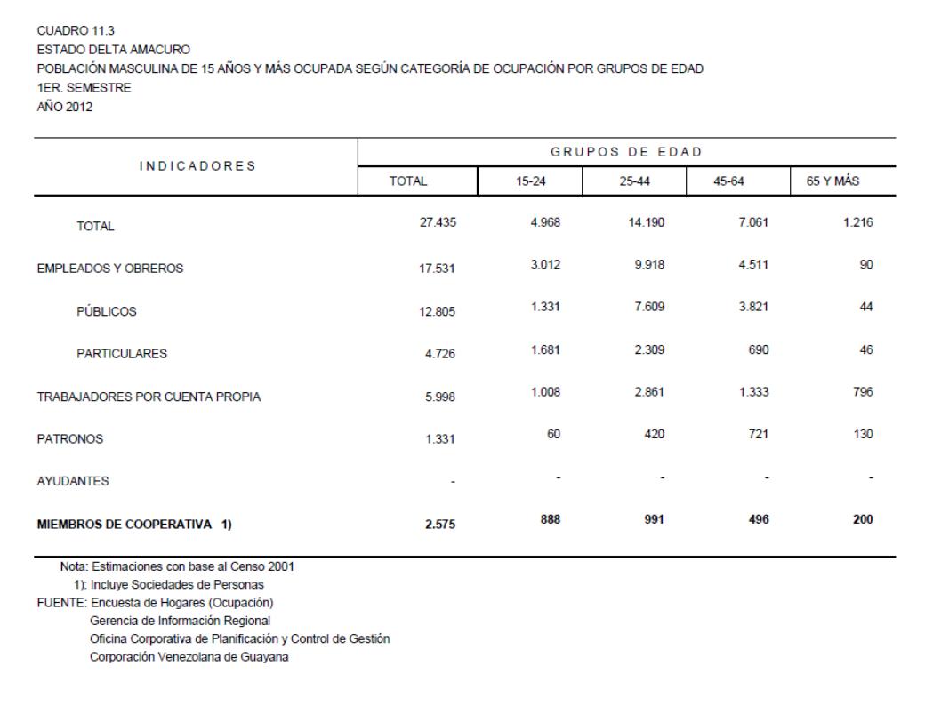 11.3 Estado Delta Amacuro Población Masculina De 15 Años Y Más Ocupada Según Categoría De Ocupación Por Grupos De Edad, Año: 2012