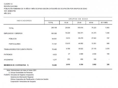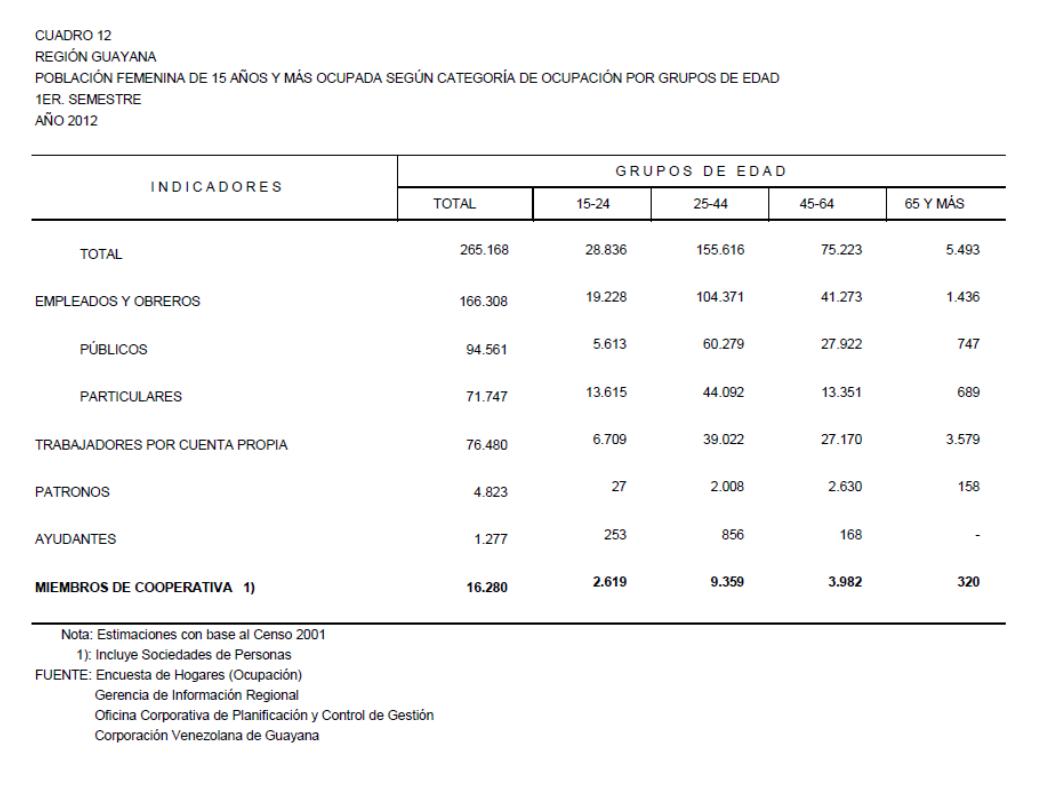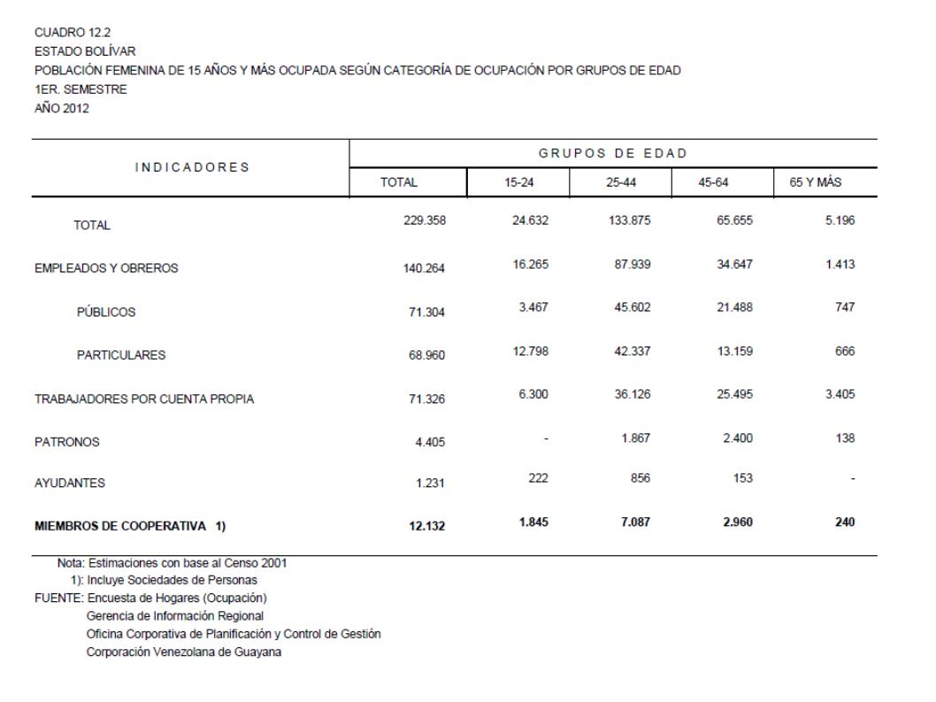 12.2 Estado Bolívar Población Femenina De 15 Años Y Más Ocupada Según Categoría De Ocupación Por Grupos De Edad, Año: 2012