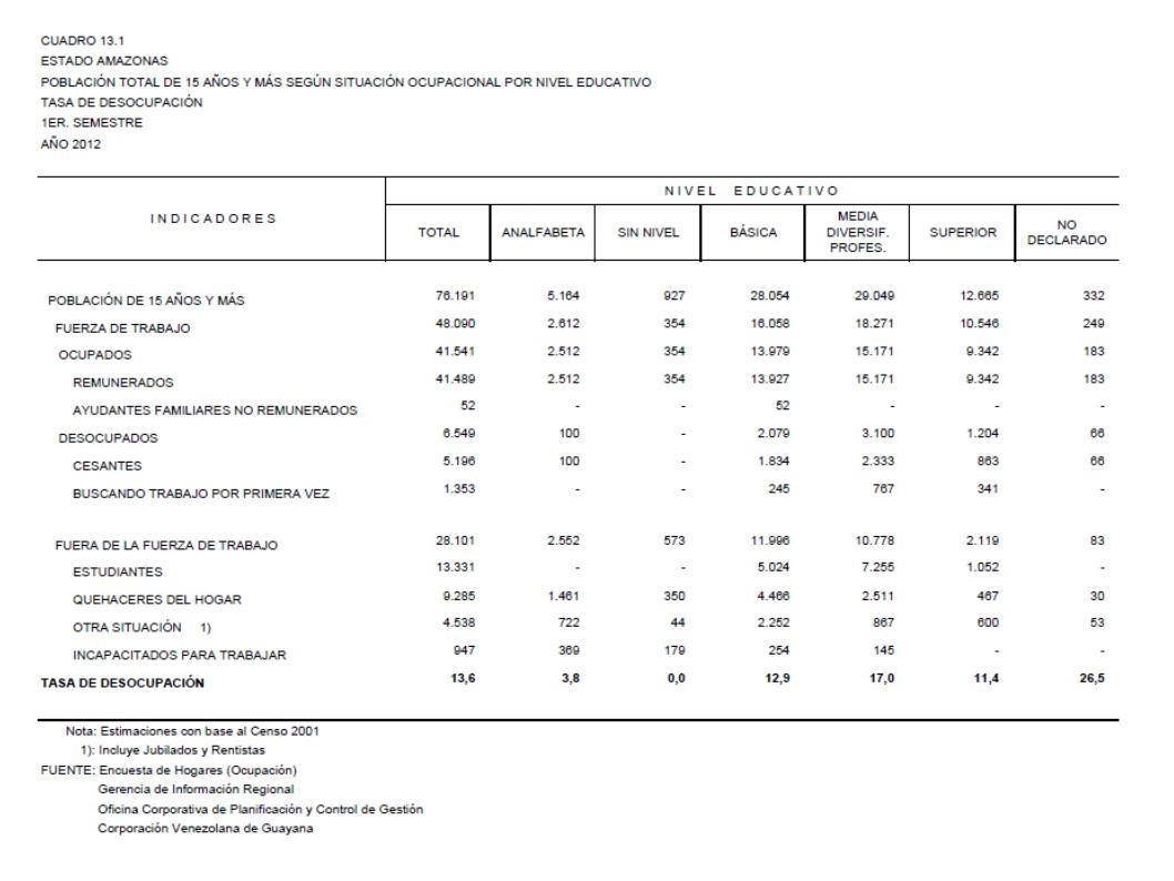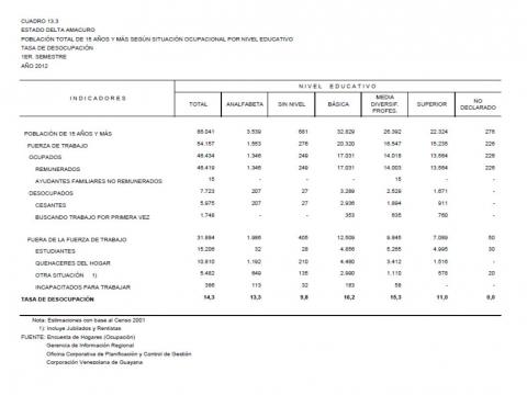 13.1 Estado Amazonas Población Total De 15 Años Y Más Según Situación Ocupacional Por Nivel Educativo. Tasa De Desocupación, Año: 2012