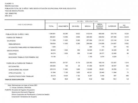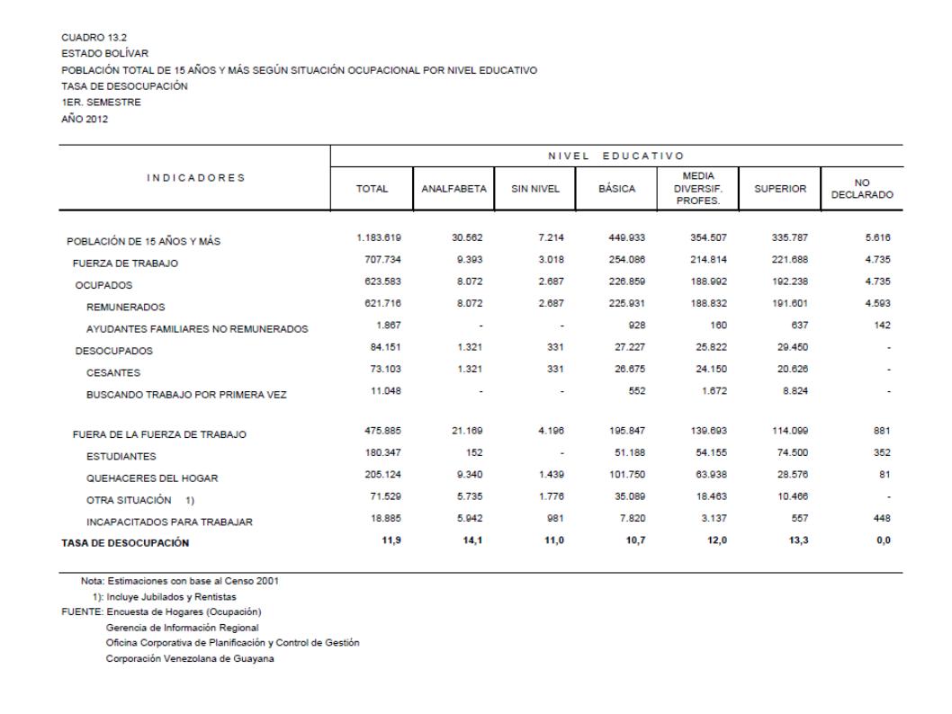 13.2 Estado Bolívar Población Total De 15 Años Y Más Según Situación Ocupacional Por Nivel Educativo. Tasa De Desocupación, Año: 2012
