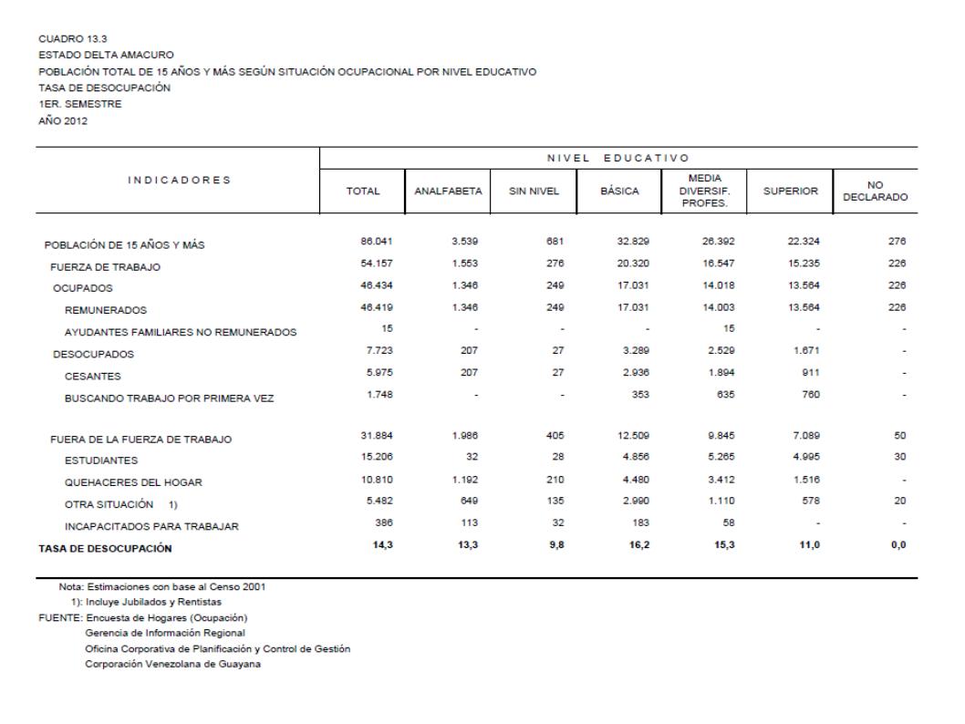 13.3 Estado Delta Amacuro Población Total De 15 Años Y Más Según Situación Ocupacional Por Nivel Educativo. Tasa De Desocupación, Año: 2012