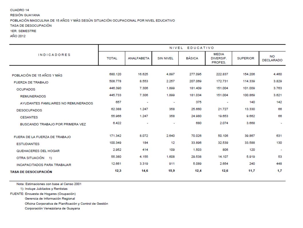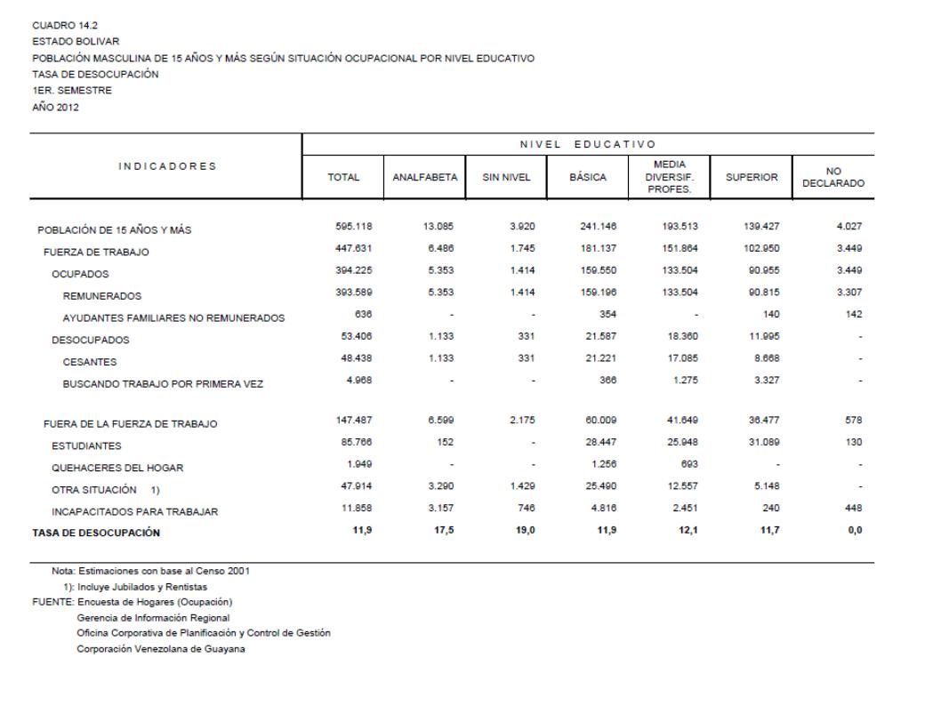 14.2 Estado Bolívar Población Masculina De 15 Años Y Más Según Situación Ocupacional Por Nivel Educativo. Tasa De Desocupación, Año: 2012