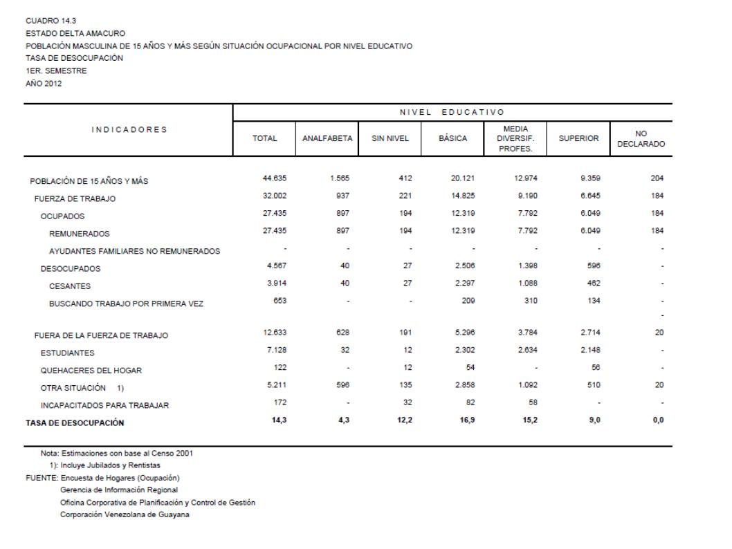14.3 Estado Delta Amacuro Población Masculina De 15 Años Y Más Según Situación Ocupacional Por Nivel Educativo. Tasa De Desocupación, Año: 2012