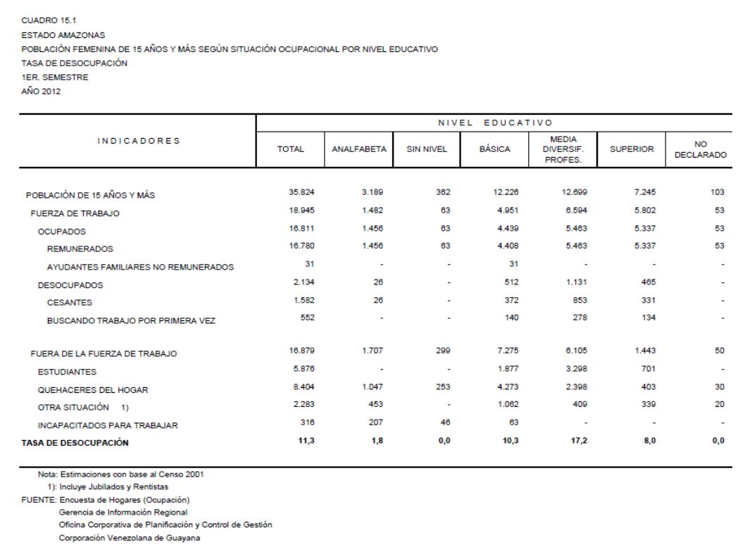 15.1 Estado Amazonas Población Femenina De 15 Años Y Más Según Situación Ocupacional Por Nivel Educativo. Tasa De Desocupación, Año: 2012
