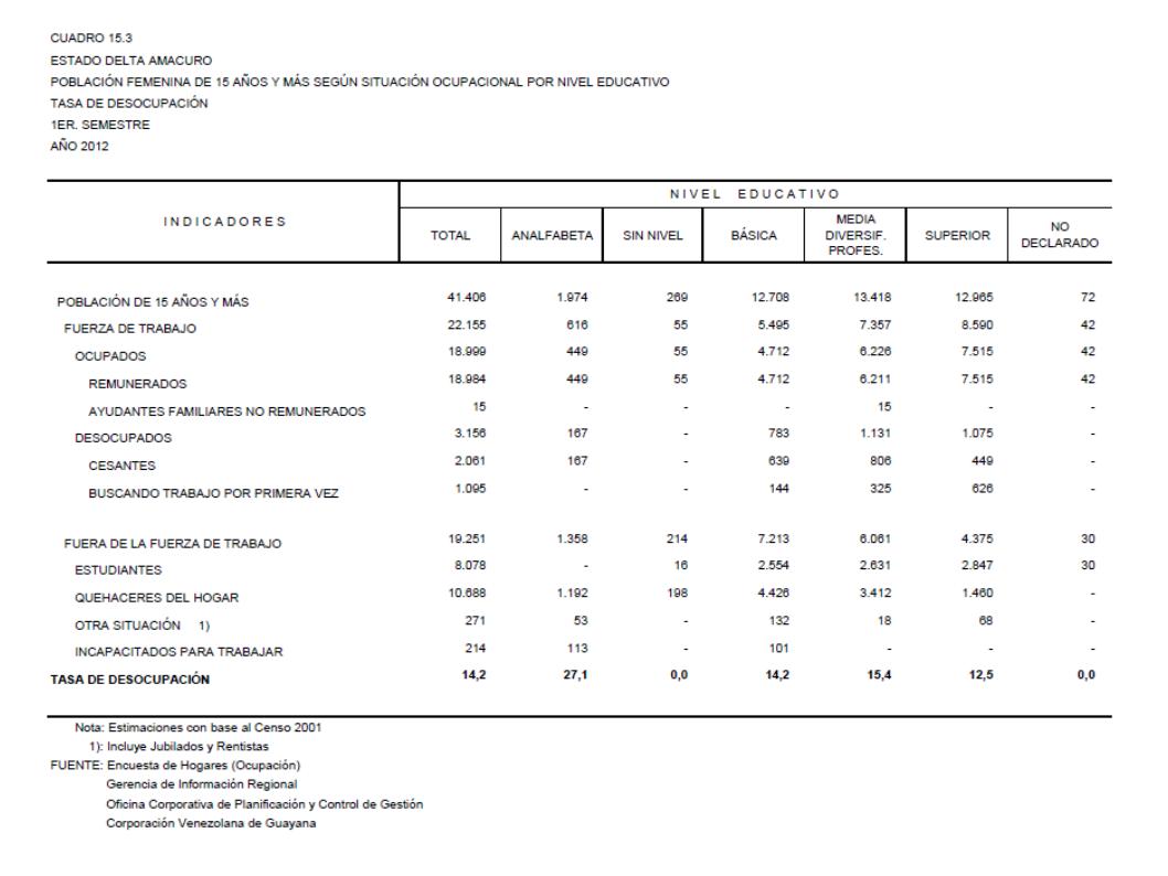 15.3 Estado Delta Amacuro Población Femenina De 15 Años Y Más Según Situación Ocupacional Por Nivel Educativo. Tasa De Desocupación, Año: 2012