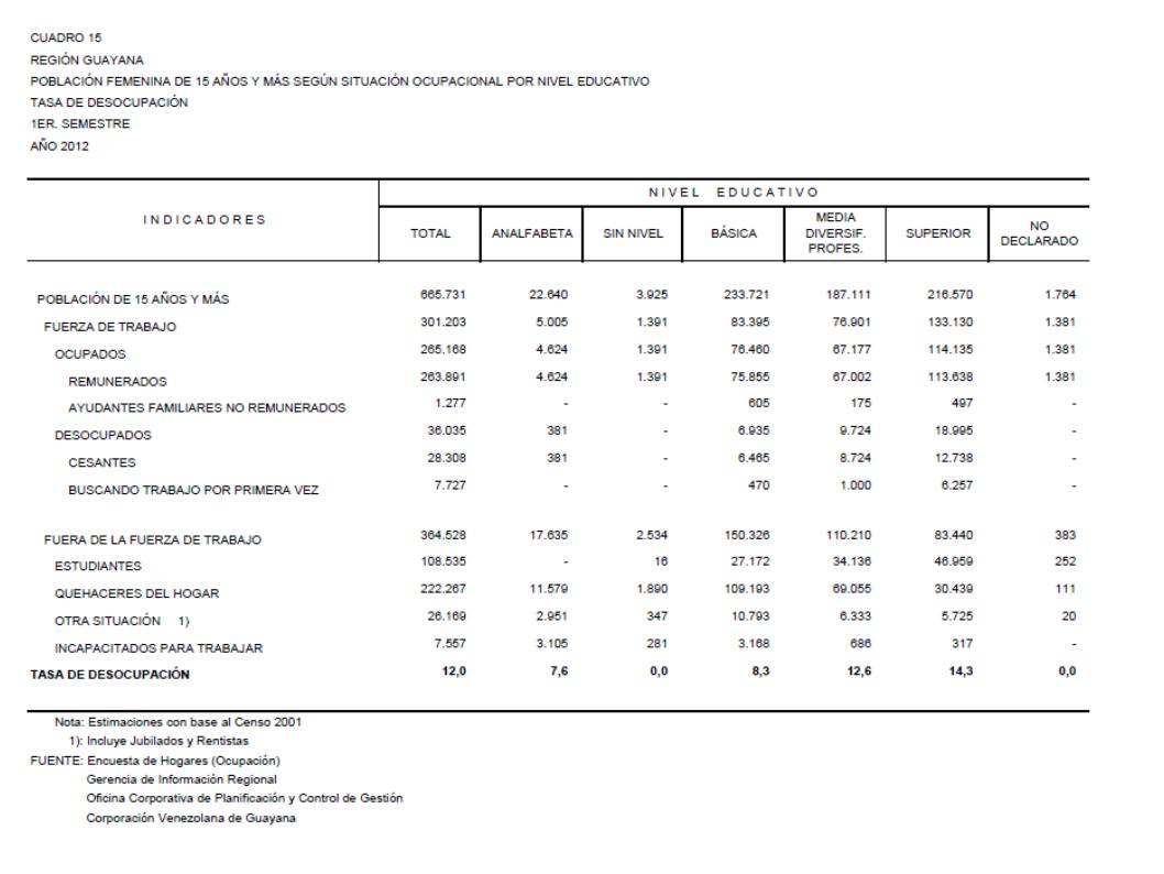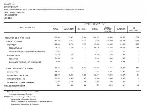 15.2 Estado Bolívar Población Femenina De 15 Años Y Más Según Situación Ocupacional Por Nivel Educativo. Tasa De Desocupación, Año: 2012