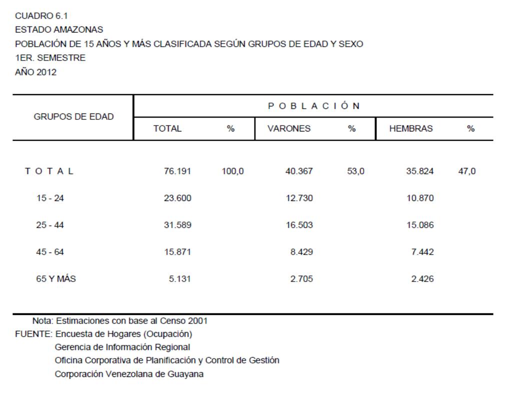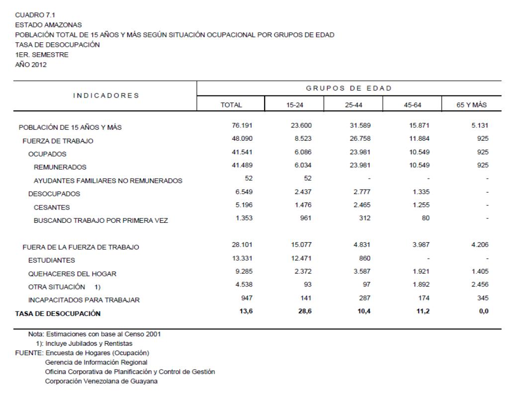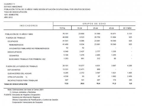 7.1 Estado Amazonas Población Total De 15 Años Y Más Según Situación Ocupacional Por Grupos de Edad. Tasa De Desocupación, Año: 2012
