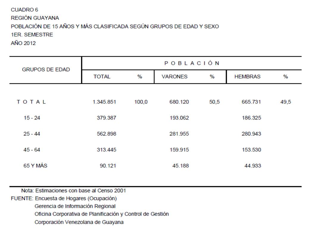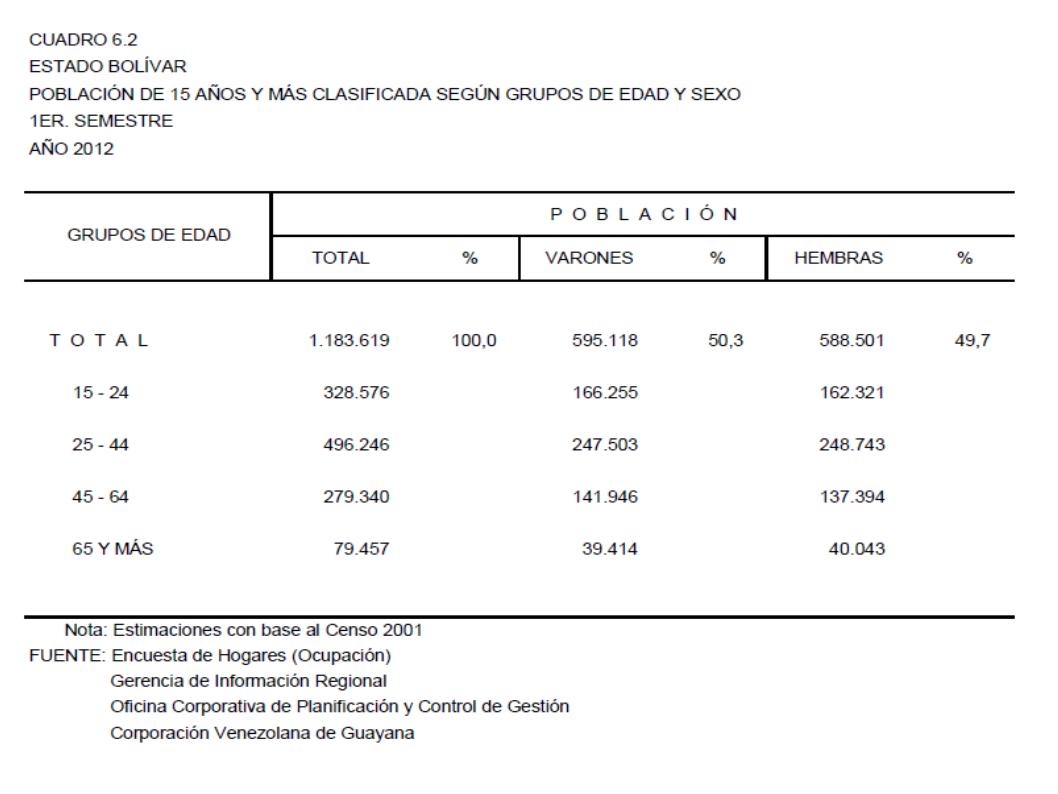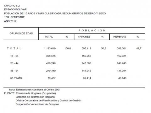 6.2 Estado Bolívar (Población Total Clasificada Según Grupos de Edad y Sexo, Año: 2012)