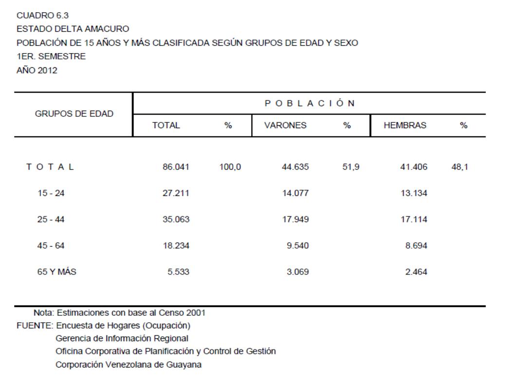 6.3 Estado Delta Amacuro (Población Total Clasificada Según Grupos de Edad y Sexo, Año: 2012)