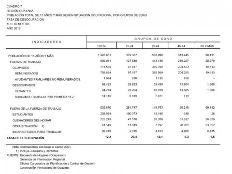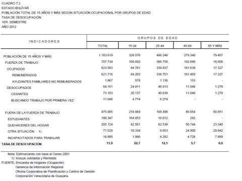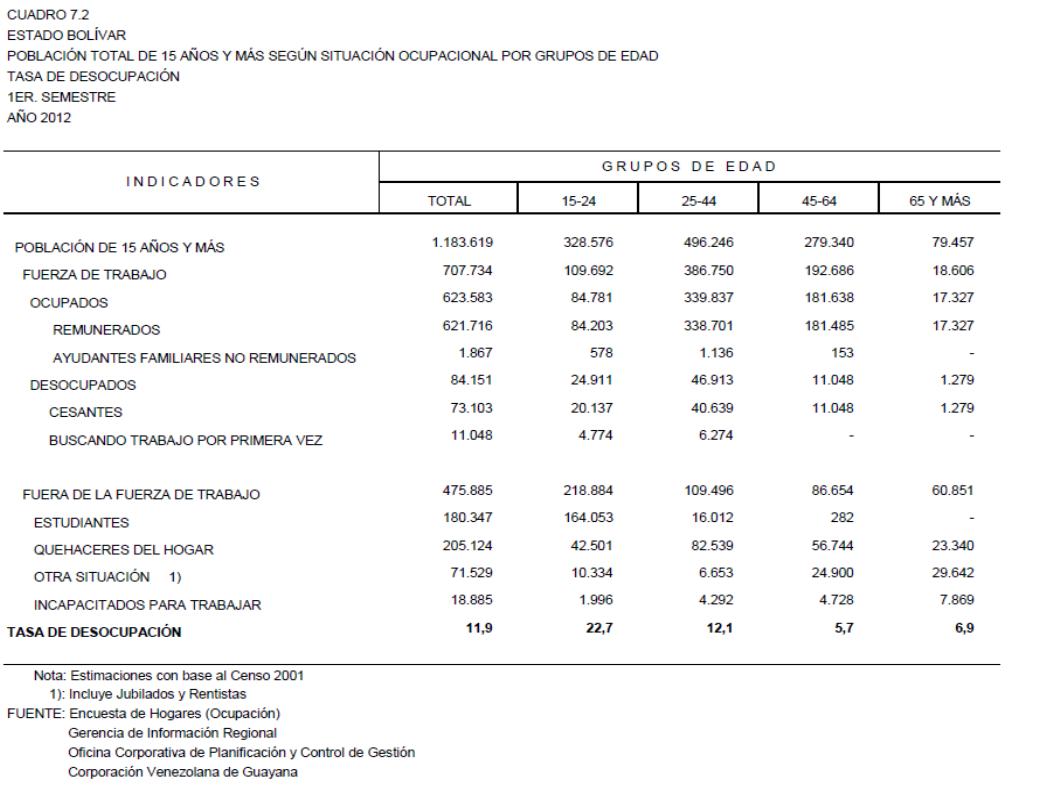7.2 Estado Bolívar Población Total De 15 Años Y Más Según Situación Ocupacional Por Grupos de Edad. Tasa De Desocupación, Año: 2012