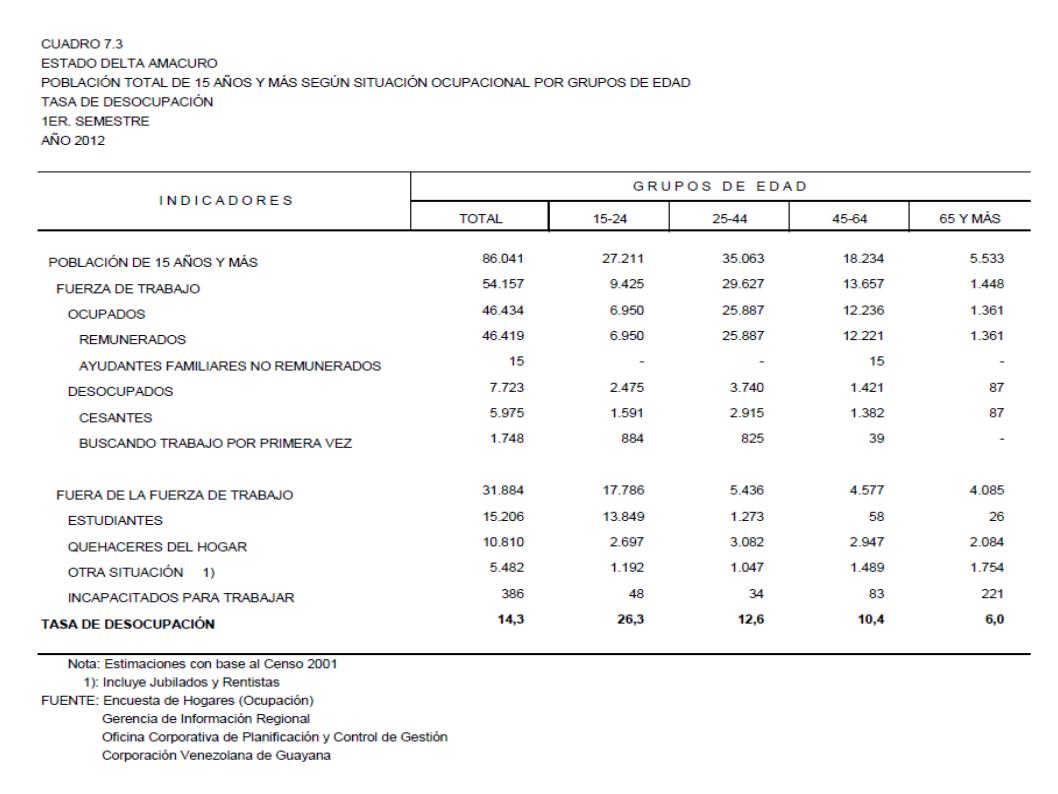 7.3 Estado Delta Amacuro Población Total De 15 Años Y Más Según Situación Ocupacional Por Grupos de Edad. Tasa De Desocupación, Año: 2012