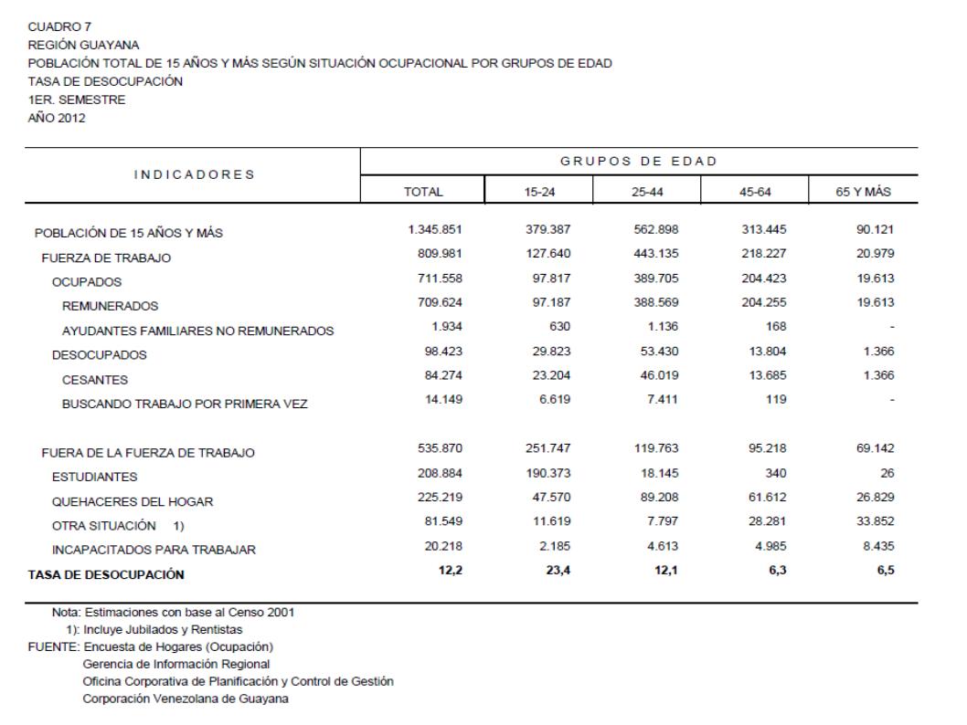 7. Población Total De 15 Años Y Más Según Situación Ocupacional por Grupos de Edad. Tasa De Desocupación, Año: 2012)