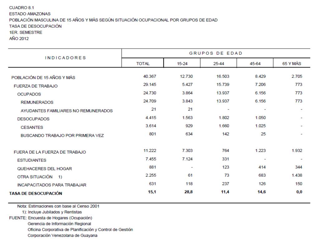8.1 Estado Amazonas Población Masculina De 15 Años Y Más Según Situación Ocupacional Por Grupos De Edad. Tasa De Desocupación, Año: 2012