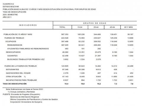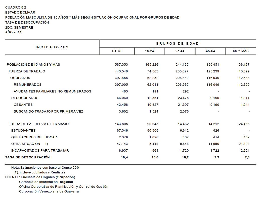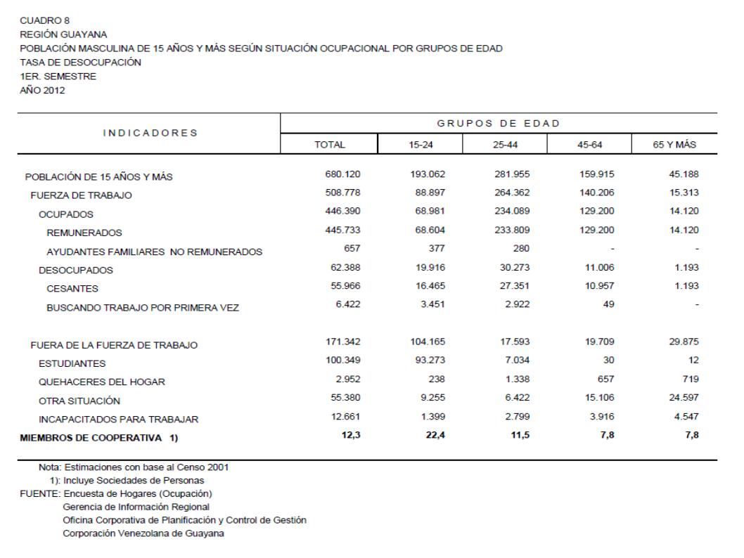 8.2 Estado Bolívar Población Masculina De 15 Años Y Más Según Situación Ocupacional Por Grupos De Edad. Tasa De Desocupación, Año: 2012