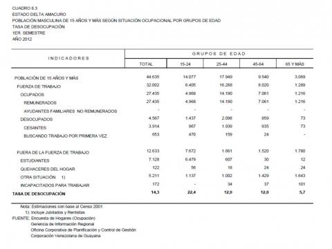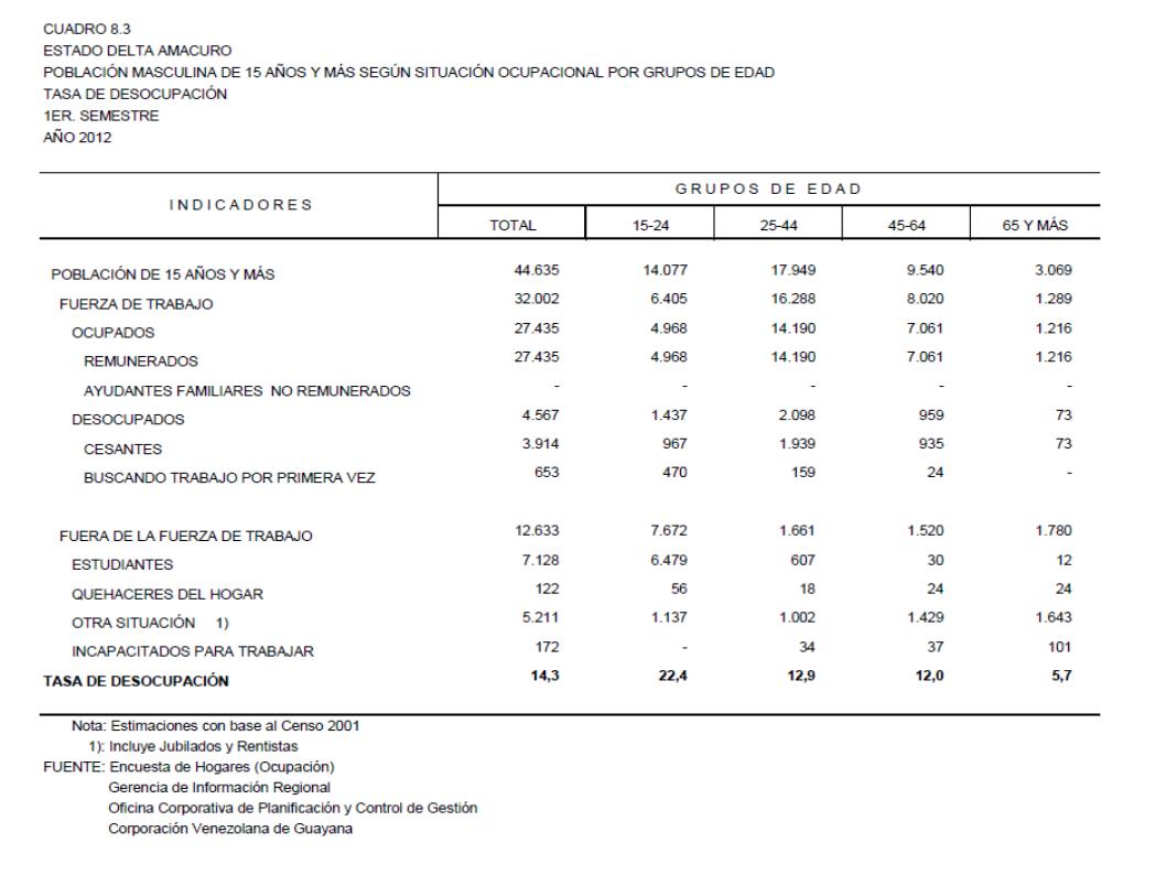 8.3 Estado Delta Amacuro Población Masculina De 15 Años Y Más Según Situación Ocupacional Por Grupos De Edad. Tasa De Desocupación, Año: 2012