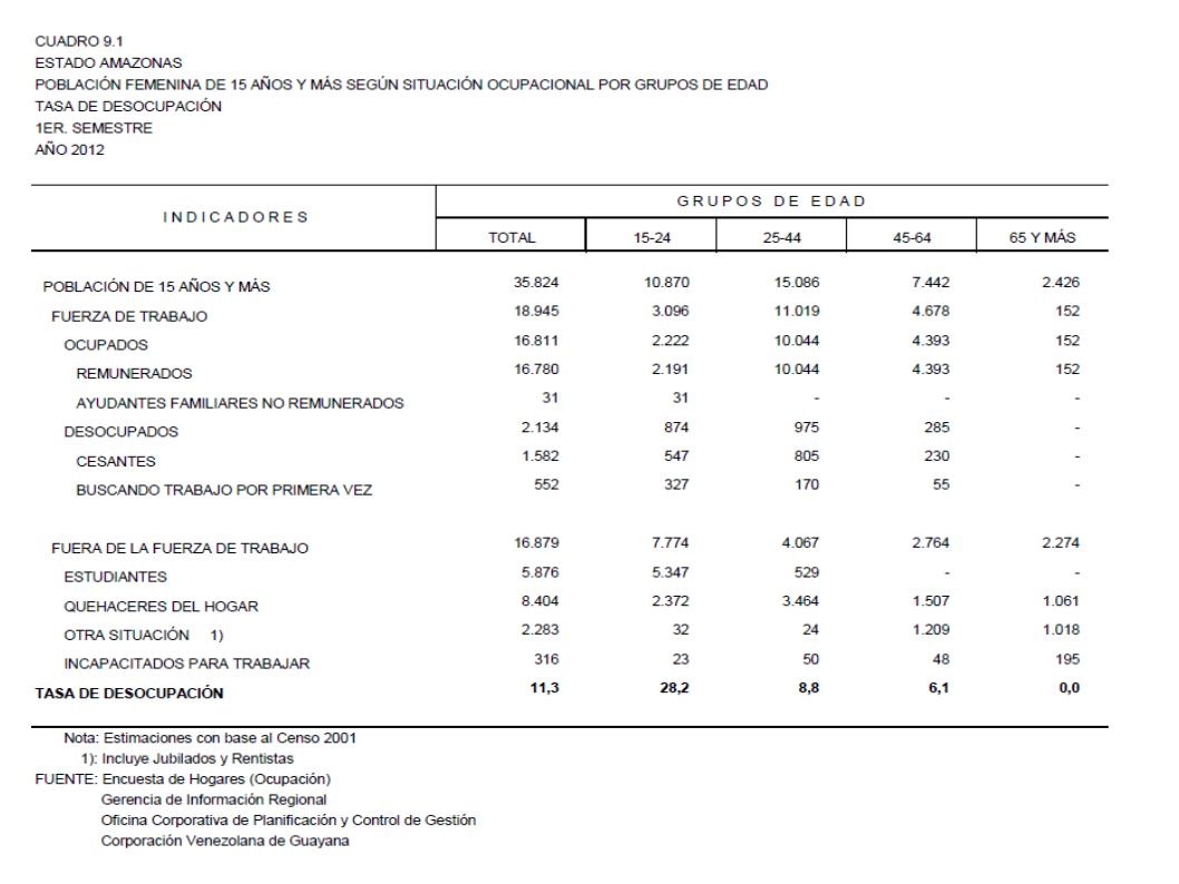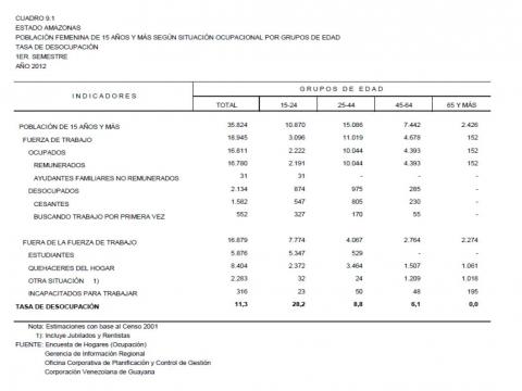 9.1 Estado Amazonas Población Femenina De 15 Años Y Más Según Situación Ocupacional Por Grupos De Edad. Tasa De Desocupación, Año: 2012