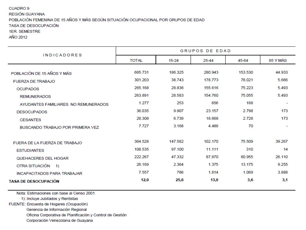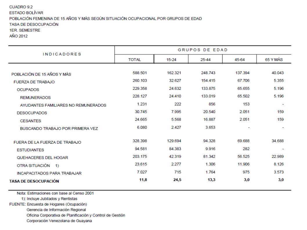 9.2 Estado Bolívar Población Femenina De 15 Años Y Más Según Situación Ocupacional Por Grupos De Edad. Tasa De Desocupación, Año: 2012