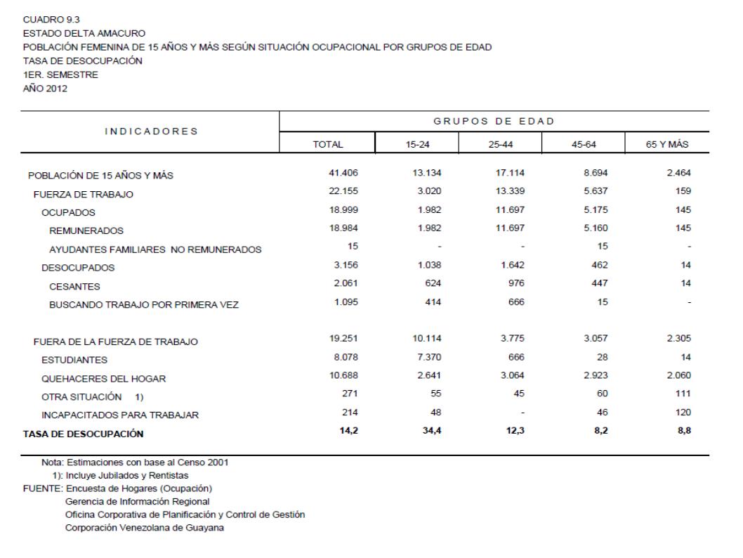 9.3 Estado Delta Amacuro Población Femenina De 15 Años Y Más Según Situación Ocupacional Por Grupos De Edad. Tasa De Desocupación, Año: 2012