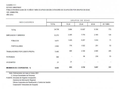 11.1 Estado Amazonas Población Masculina De 15 Años Y Más Ocupada Según Categoría De Ocupación Por Grupos De Edad, Año: 2012