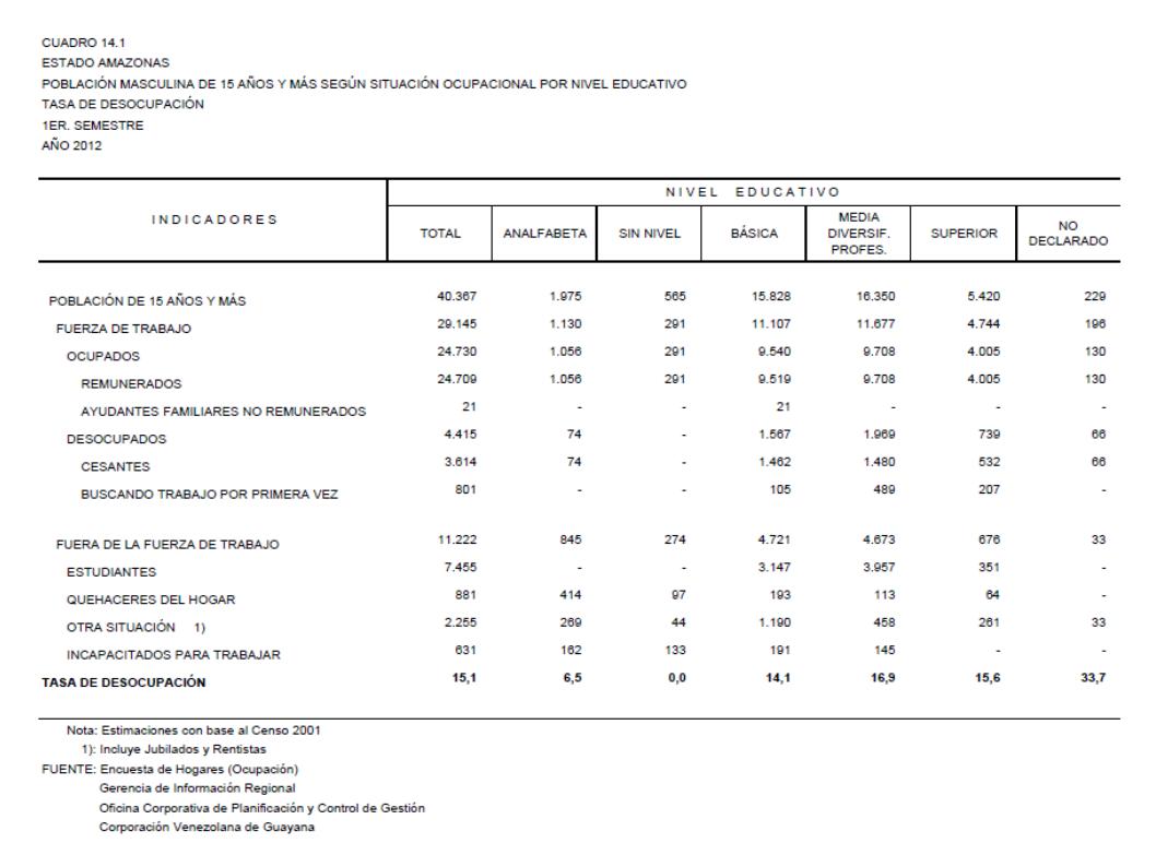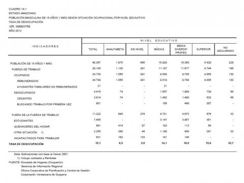 14.1 Estado Amazonas Población Masculina De 15 Años Y Más Según Situación Ocupacional Por Nivel Educativo. Tasa De Desocupación, Año: 2012